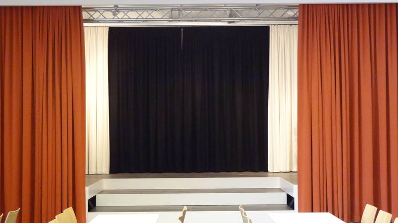 ![]() Stage, type Trenomat Airstage with track system, manual design, closed ![]() Main curtain in motion | ![]() equipped with main curtain, effects and backdrop curtain ![]() Main curtain completely opened with lateral bundles | ||