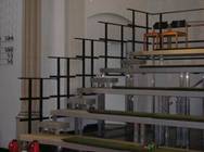 | Stahlkonstruktion aus Rechtecktrohr 50/20/2 mm (Streben) 40/10/2 mm (Knieschutz), 40/20/2 mm (Handlauf) Beschichtung: Polymaid schwarz Länge: 1,0 m oder 2,0 m alternativ, Sonderlängen auf Anfrage Höhe: 1,0 m Gwicht: ca. 12,0 kg (1,0 m) 16,0 kg (2 m) Andere RAL-Farbtöne gegen Aufpreis möglich Zubehör: Eckverbinder, Zwischenstücke für Stufenaufbau Lagerwagen für Geländer | |