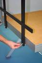 Die Befestigung der Geländer erfolgt mittels 2 STCK Geländerbefestigungsklammern, die von der rückwärtigen Seite in das Profil des Bühnenpodestes eingebracht werden und auf deren Schrauben die Geländer aufgesteckt und mit der entsprechenden Hutmuttern festgeschraubt werden. Befestigungsklammern und Zwischenstück zum Verbund der Geländer untereinander gehören bereits zum Lieferumfang.