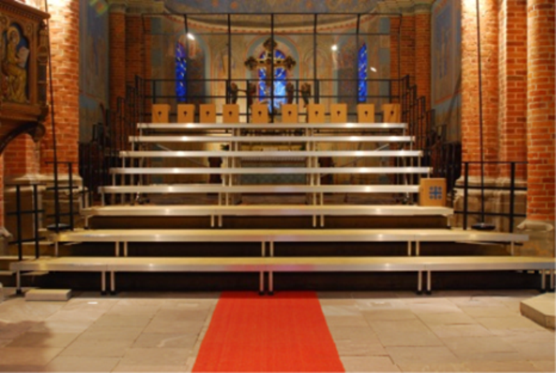 ![]() Mobiles Chorpodest aus Bühnenpodesten Typ Trenomat FIX in einer Kirche | ![]() mit rückwärtiger Akustikausstattung | |