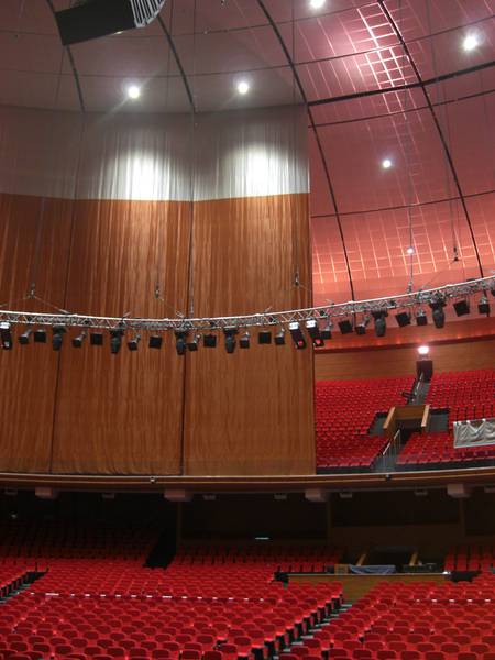 ![]() Mittels Trennvorhängen wird die Halle zu 3 separaten Aktionseinheiten | ![]() Hochgezogen in Ruhestellung | |